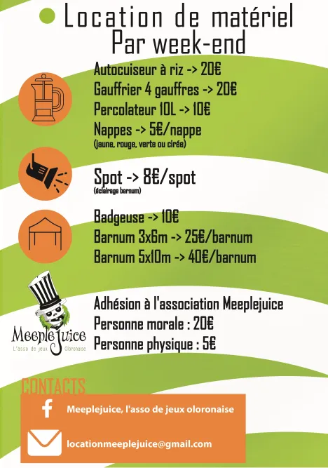 Des barnums, des gaufriers, des napes, des spots, une badgeuse, un percolateur, un lave vaisselle, etc....